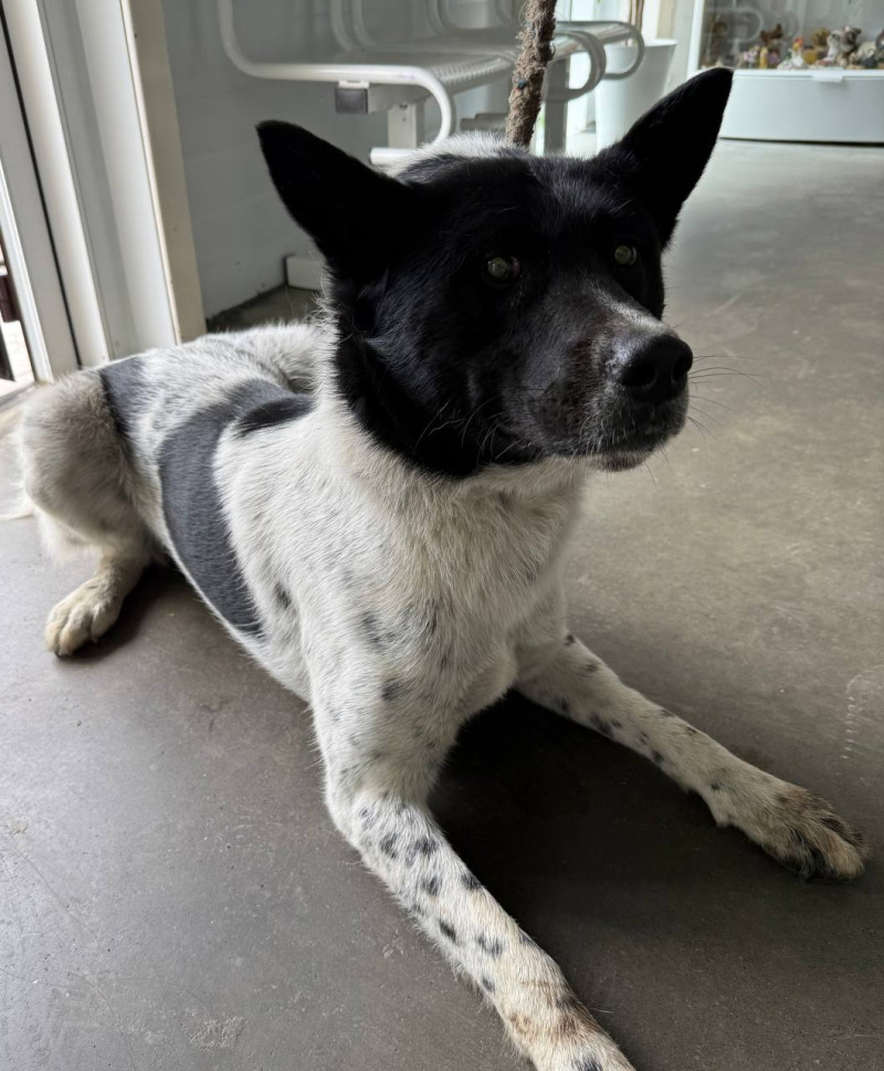 отлов 31.07.25 ст. Компрессорная (жд), собака беспородная, сука, 5 лет, бело черный окрас