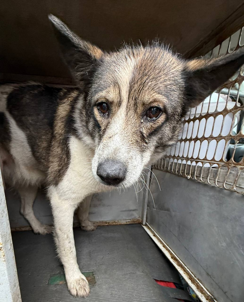 собака беспородная сука 8 лет бело-серый окрас