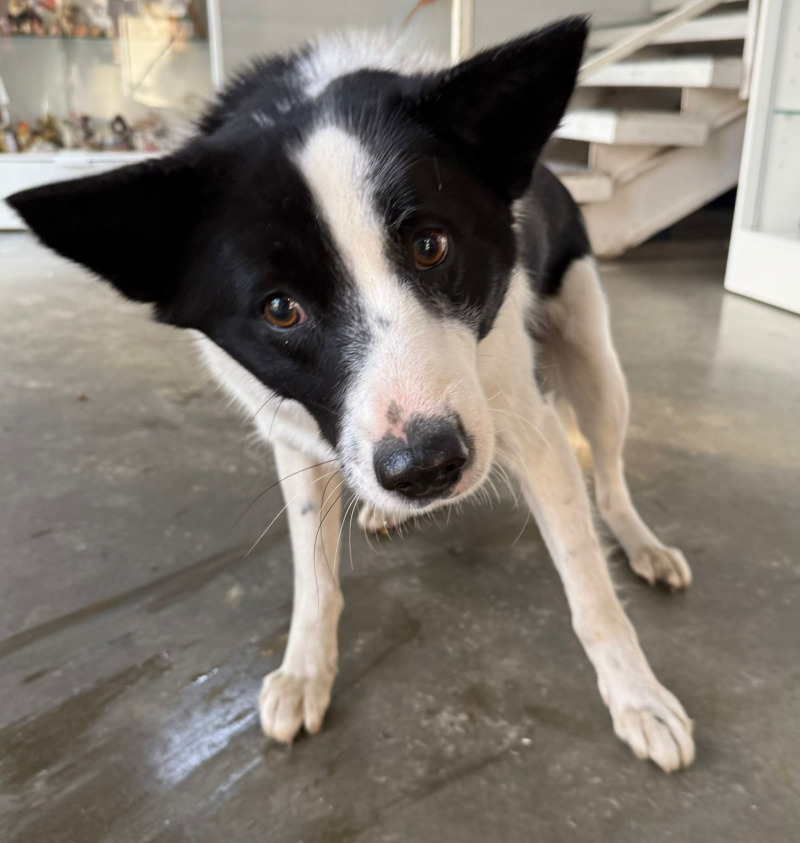 собака беспородная, кобель 2 года, бело-черного окраса