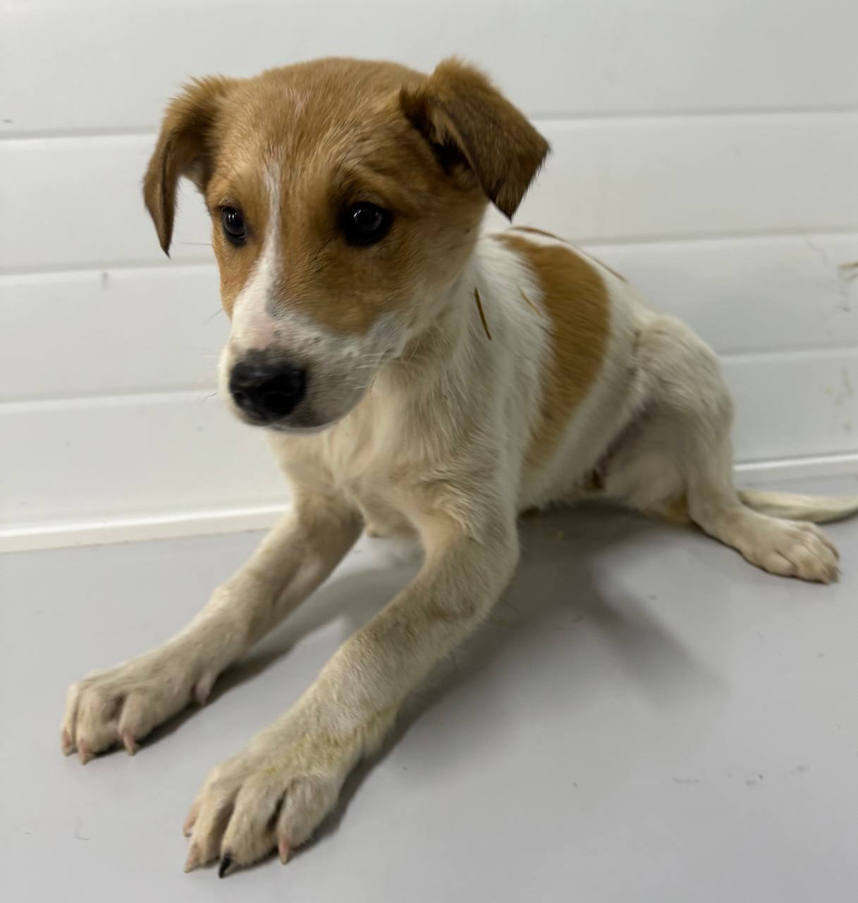 собака беспородная, сука 6 мес, бело-рыжего окраса