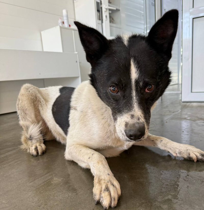 собака беспородная, кобель 6 лет, бело-черного окраса.