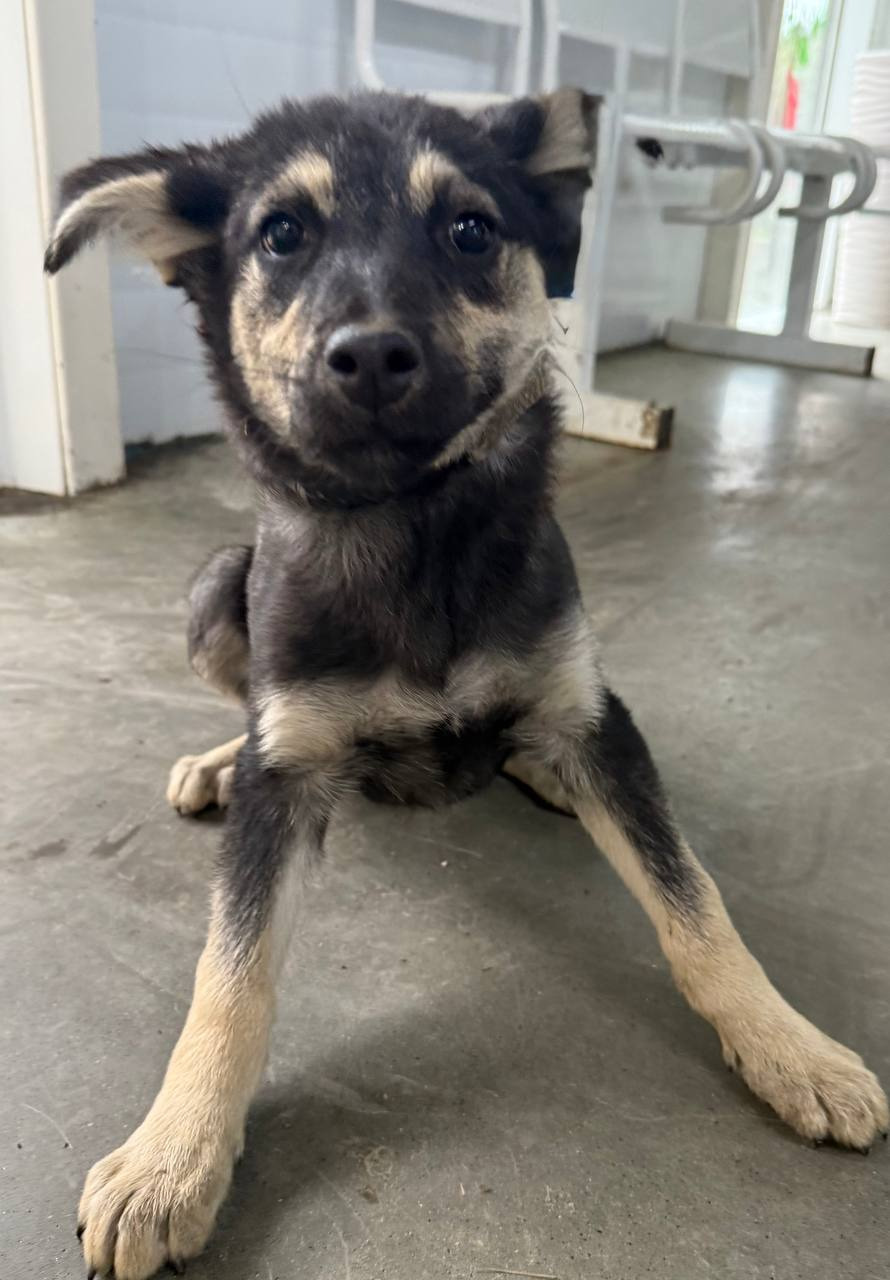 собака беспородная, сука 4 мес серо-черного окраса