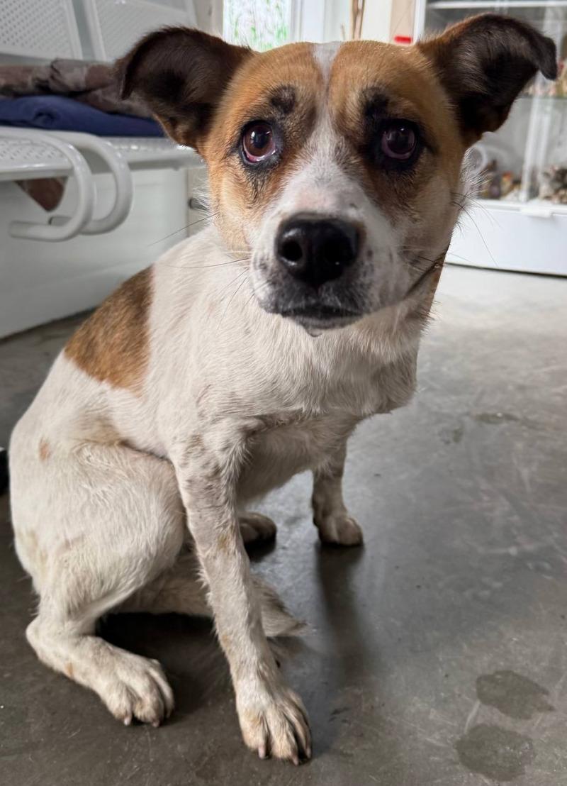 собака беспородная, сука 6 лет, бело-рыжего окраса