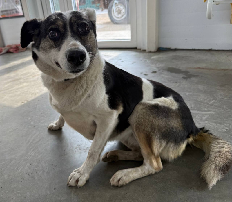 собака беспородная, сука 6 лет, бело-черного окраса
