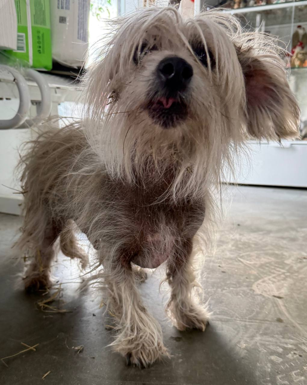собака породы китайская хохлатая,кобель 3 года, белого окраса