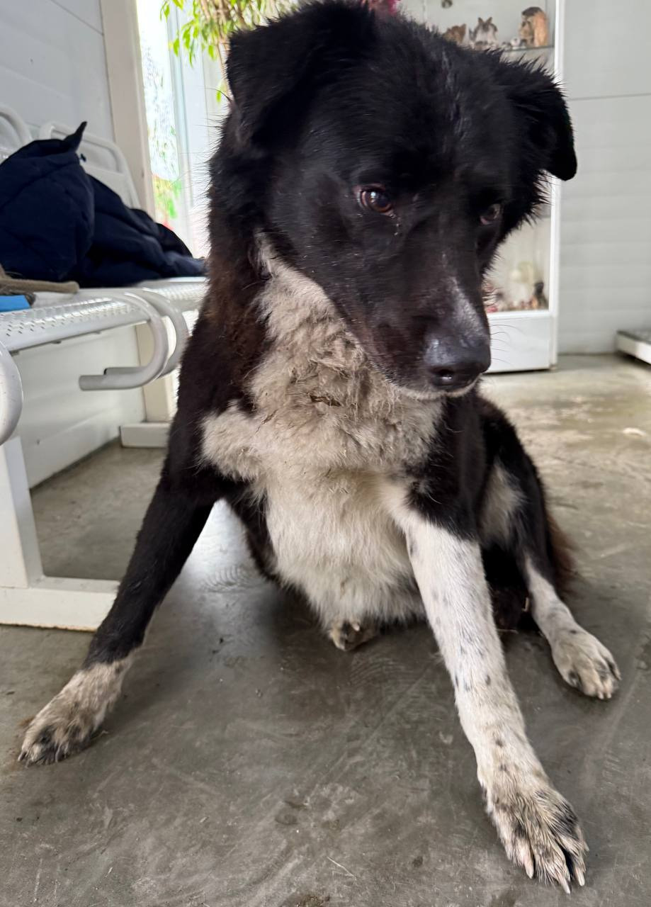 собака беспородная, сука 9 лет,черно-белого окраса