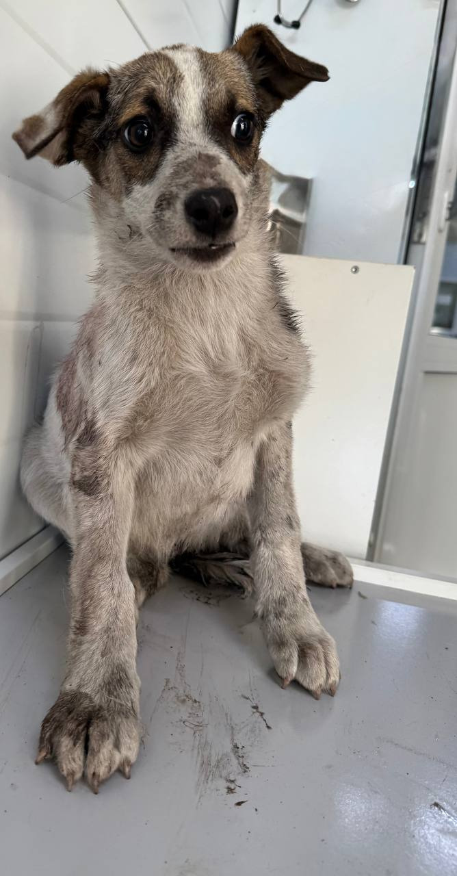 собака беспородная, сука 6 мес, бело-коричневого окраса