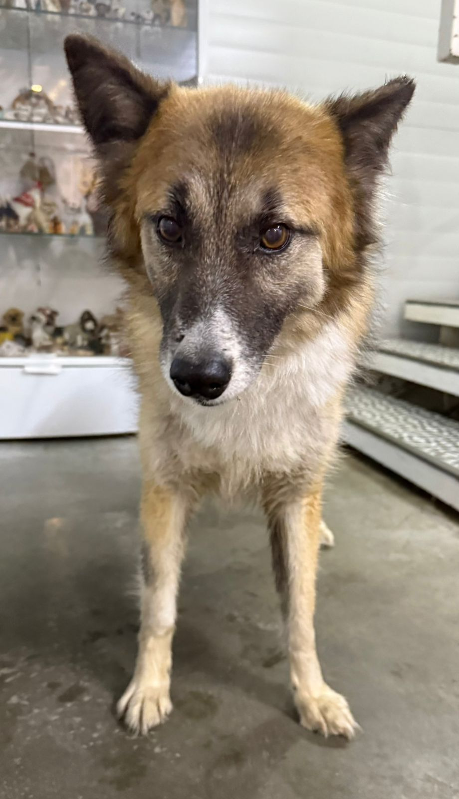 собака беспородная, сука 6 лет, рыже-белого окраса