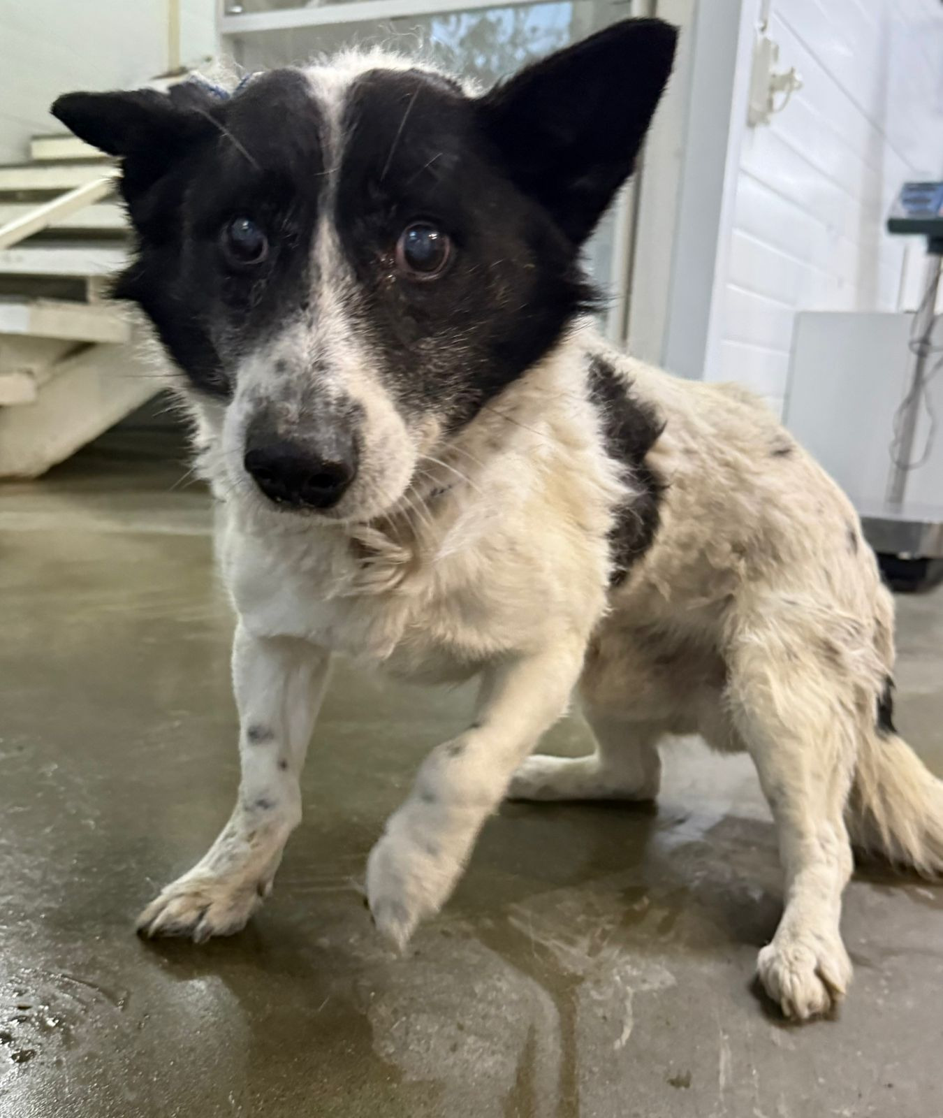 собака беспородная, кобель 8 лет, бело-черного окраса